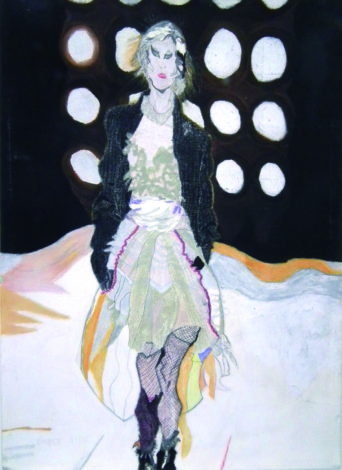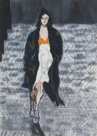 He loves contemporary high fashion and using his favourite fashion magazines as reference, he draws his admired brand runway scenes with pastels. The thickness and softness of the pastels slightly deform the beautifully dressed models, making them even more lively. The contradiction between the perfect beauty of the clothing and the funny facial expressions of the models make his paintings intriguing.