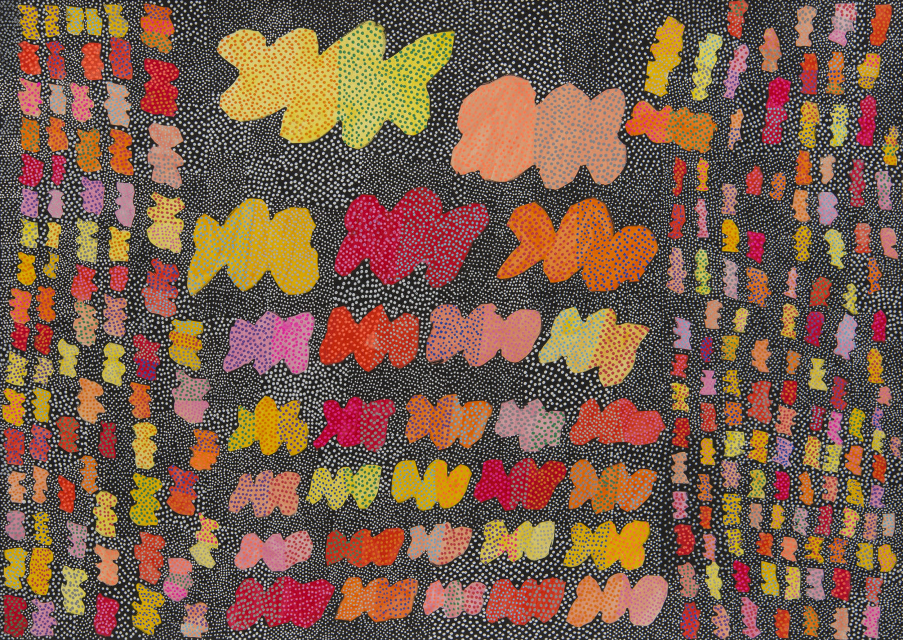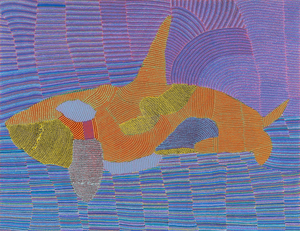 描かれるモチーフは、身の回りのモノや季節のものの他に、悪戯心が現れたモチーフも登場する。それらを点描によって描くのだが、点描は年々細かになってきている。またモチーフ(図)だけでなく、背景(地)の色分けも工夫され、その上の点描による色彩効果が加わり、複雑で重層的な作品が生み出される。