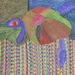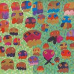 The motifs she draws include things from her daily life, seasonal things, as well as things she picks mischievously. She makes stipple drawings with these motifs and the stipples in her drawings have been getting finer over years. Not only the figures but also the backgrounds are carefully drawn with different colours. They are then stippled on top adding colour effects, creating complex and multilayered works.